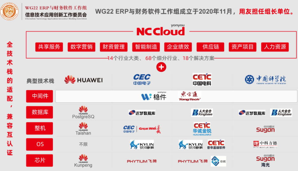 為了推動信創(chuàng)產(chǎn)業(yè)發(fā)展,用友參與了信創(chuàng)聯(lián)盟、信創(chuàng)工委會、WG22 ERP與財務(wù)軟件工作組等組織機構(gòu)。用友NC Cloud與華為鯤鵬體系和中國電子PKS體系等國內(nèi)主流的信創(chuàng)產(chǎn)品進行全棧適配。截止2021年5月,用友NC Cloud已與近50個國產(chǎn)化產(chǎn)品實現(xiàn)兼容認證,形成安全可信的數(shù)智化解決方案。