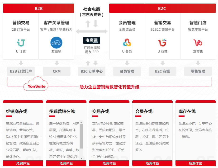 互聯(lián)網(wǎng)的普及徹底顛覆了企業(yè)的傳統(tǒng)交易模式,消費習(xí)慣也隨之改變,B2B 與 B2C 業(yè)務(wù)與互聯(lián)網(wǎng)深入融合,線上業(yè)務(wù) 飛速發(fā)展。YonSuite 天然的云原生讓企業(yè)從經(jīng)銷商到會員,從交易到庫存到結(jié)算和對賬可以全在線完成,通過大數(shù)據(jù)驅(qū)動 精準(zhǔn)營銷,智能購物體驗可以有效增強客戶粘性。
